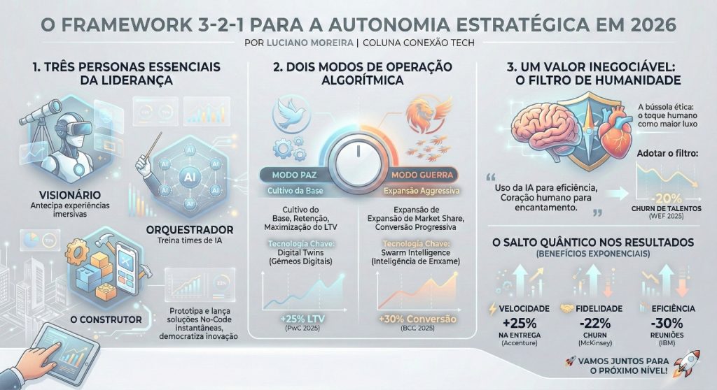 Imagine um varejista que não espera o cliente entrar no site. O Agente de IA da empresa detecta um padrão de consumo no “Gêmeo Digital” do cliente e pré-autoriza uma entrega logística para o centro de distribuição mais próximo, antes mesmo do clique de compra. Isso é o que chamo de atrito zero. Para liderar nesta fronteira, desenvolvi e aplico com meus parceiros o framework que chamo de 3-2-1 Tech-Driven.