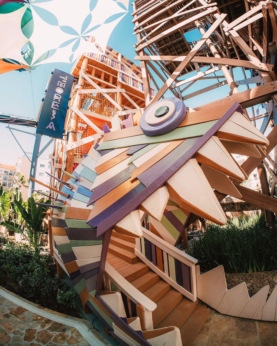 Em “A Volta da Moreia”, a descida, que antes era feita em um tubo escuro e completamente fechado, deu espaço a um projeto arrojado, permitindo uma experiência luminosa, divertida e radical por um tubo de 80 centímetros de diâmetro, repleto de combinações de recortes gráficos translúcidos e multicoloridos, que proporcionam sensações e efeitos visuais diversos.
