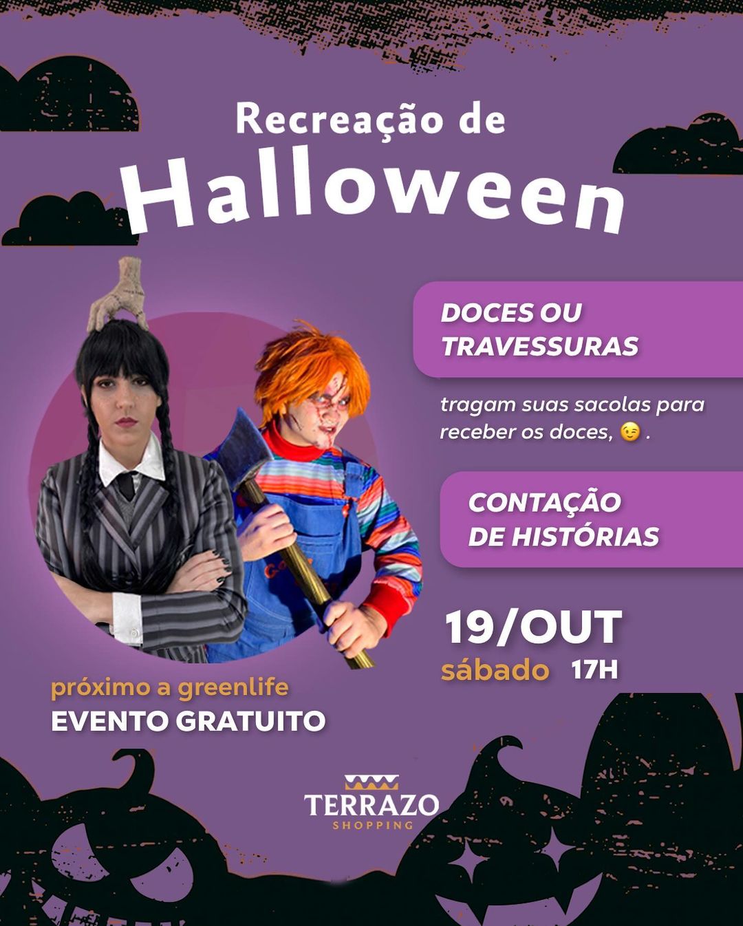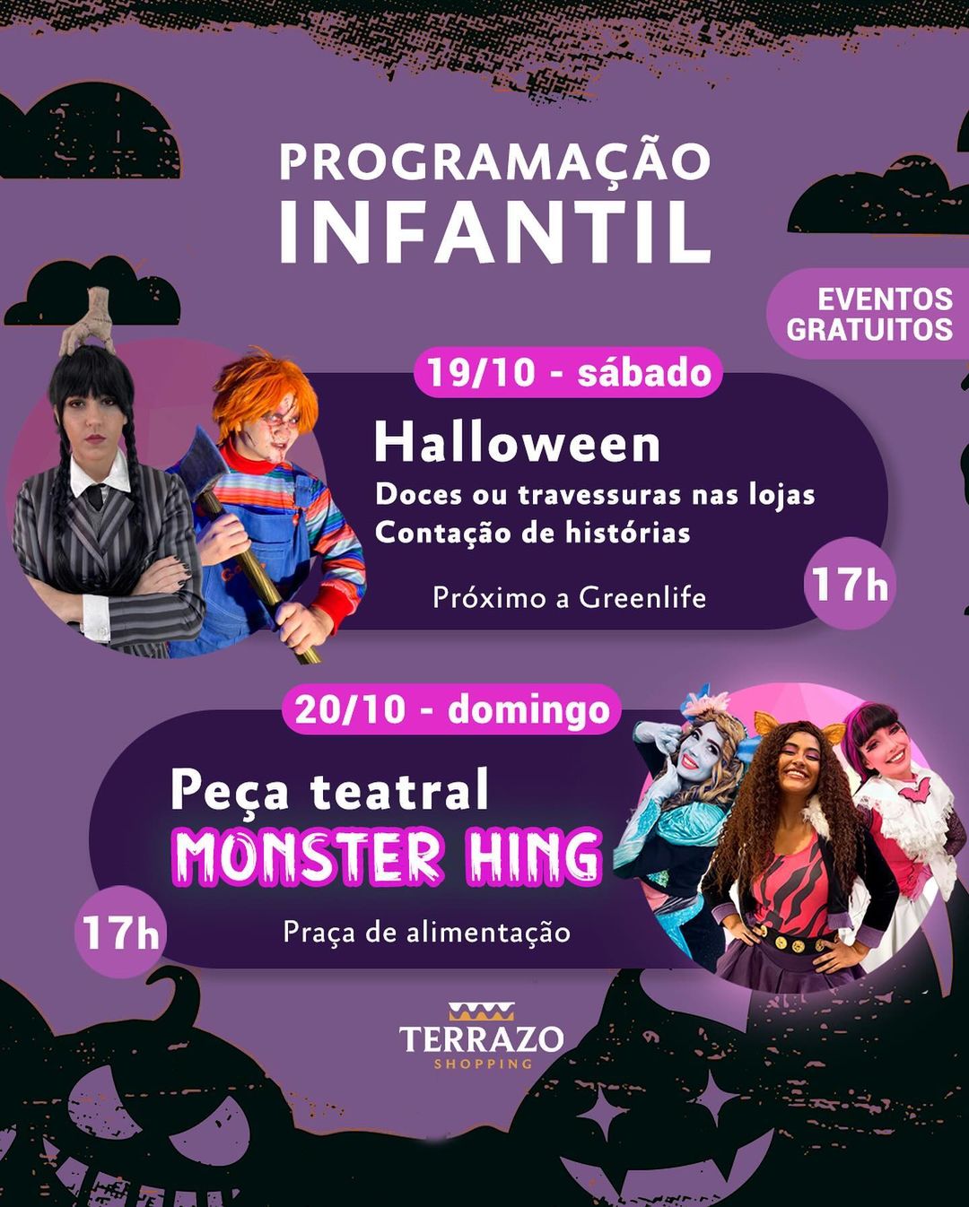 O Terrazo Shopping convida as crianças para uma programação infantil gratuita com o tema Halloween que acontece neste fim de semana. No sábado (19), os pequenos poderão trazer sacolinhas para realizar “Doces ou Travessuras” nas lojas, e se divertirem com contação de histórias. No domingo (20) a diversão é garantida com peça teatral Monster High que acontecerá no praça de alimentação às 17h.