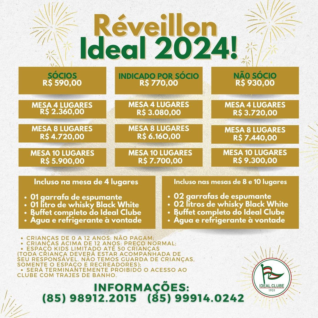 O Ideal Clube promove festa da virada chamada de “Réveillon Ideal 20234”. A festa marca também o encerramento dos festejos pelos 92 anos de aniversário do clube.