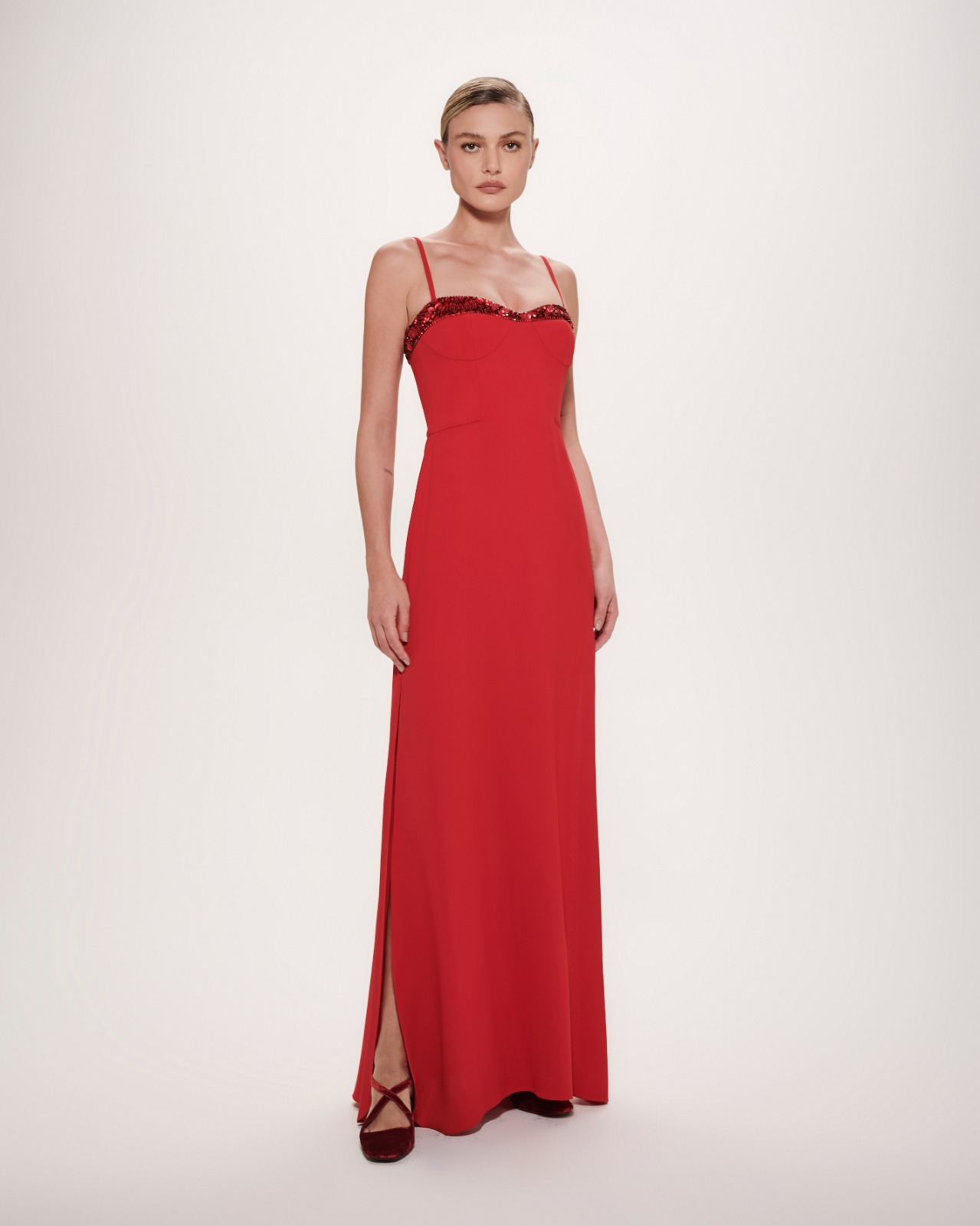 Para quem gosta de um look mais clássico, o vestido corselete na cor vermelha é uma opção da marca Printing. Para quem busca vestidos mais coloridos, o vestido longo corpo torcido na cor verde e o vestido longo com laço na cor azul mais escuro da marca Skazi são opções disponíveis na The Closet.